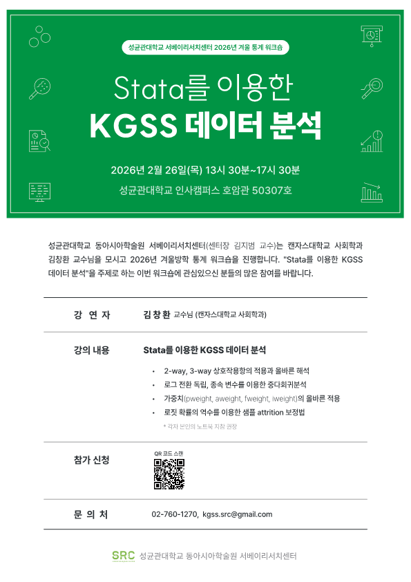 대학원생 대상 Stata를 이용한 KGSS 데이터 분석 워크숍을 아래와 같이 안내 드립니다.